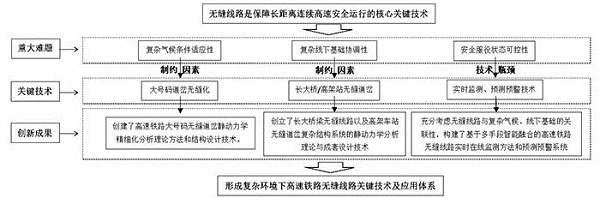 该项目实施前,国内外仅针对普通无缝线路、短桥上无缝线路、小号码无缝道岔等开展了研究,对大号码道岔无缝化、长大桥及高架站无缝线路、安全监测预警等制约高铁无缝线路发展及安全运营的核心技术研究存在严重不足,不得不在道岔区限速、在穿越河流或公路时绕行或降速,无法实现全线连续高速安全运行。在国家及部委支持下,项目历经十余年的理论与技术创新,形成了具有自主知识产权的复杂环境下高速铁路无缝线路关键技术及应用体系。