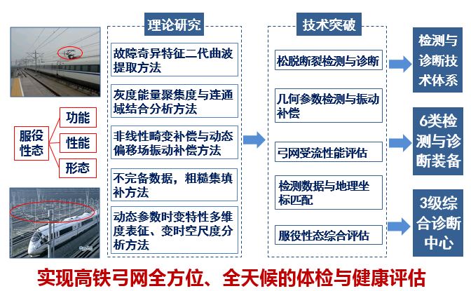 受电弓-接触网(弓网)系统是高速列车获得持续稳定动力供给的唯一途径,对其服役性态(性能-功能-形态)进行全方位“体检”与健康状态评判是大规模成网条件下高速铁路(高铁)安全、高效运营的重要保障。由于列车高速运行时弓网相互作用加剧,强烈振动导致的接触网动静态几何参数畸变、零部件“松脱断裂”、受电弓滑板裂纹,和频繁拉弧引发的接触导线与受电弓滑板灼伤,直接影响弓网受流性能,甚至引发弓网烧损与接触网垮塌,严重危及高铁安全运营,既有普铁弓网检测手段已不能满足要求。