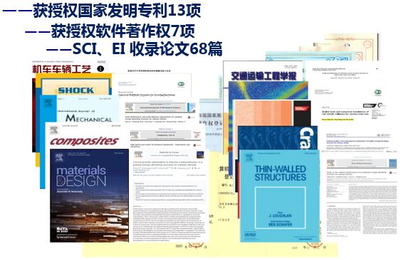 完成了包括中国标准动车组耐撞性试验及优化;完成了广深港高速动车组小底架碰撞试验及耐撞性能评估;完成了国内及出口城轨车辆耐撞性试验、评估及优化,已生产城轨车辆1996辆,运营于北京、广州、天津、成都等城市,出口阿根廷、美国、香港等国家和地区1105辆。近3年在系统上开展了901次大吨位碰撞试验,包括美国纽约、波士顿等地铁列车。制订了铁道行业标准《机车车辆撞击试验测试规范》和《动车组车体耐撞性要求与验证规范》,填补了我国列车耐撞性标准空白。具有重大的社会效益和广阔的应用前景。