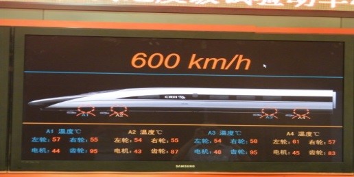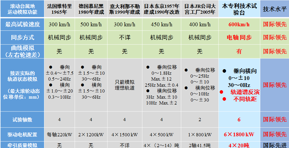 表1是世界上机车车辆整车台架试验台性能比较,可以看到,基于本专利技术研制的铁路机车车辆运行仿真试验台,在高速试验速度(600km/h)、同步方式(电轴同步)、曲线模拟(左右轮差速)、轨道不平顺模拟(轨道谱反演)、轴数(6根)和单轴功率等方面都达到世界最好。是世界上速度最高、功能最强、技术最先进、运用最成功的机车车辆运行模拟试验台。