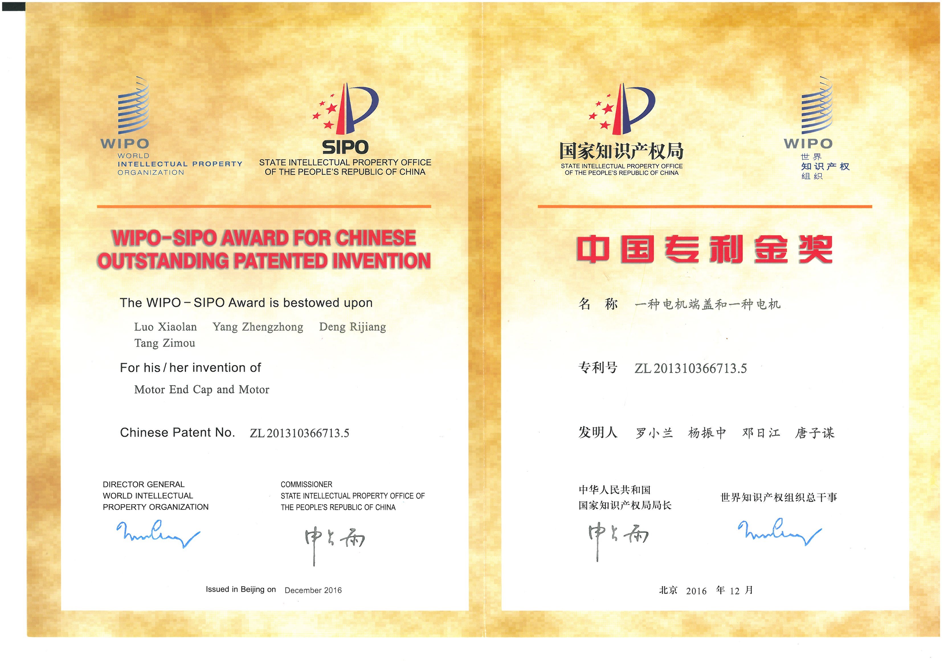 中国专利金奖证书