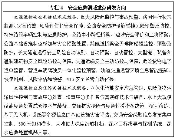 围绕提高安全风险防控和突发事件应对能力、较大幅度降低人员伤亡和经济损失等目标,开展交通运输系统安全、基础设施安全、运输组织安全和应急保障等方面的共性关键技术研发,重点突破长大隧道运行安全、深远海交通通道建设与应急保障、轨道交通运营安全保障、500米以浅水下救援打捞、10万吨级沉船整体打捞等关键技术瓶颈,不断提升交通运输安全生产水平,为打造平安交通提供技术支撑。