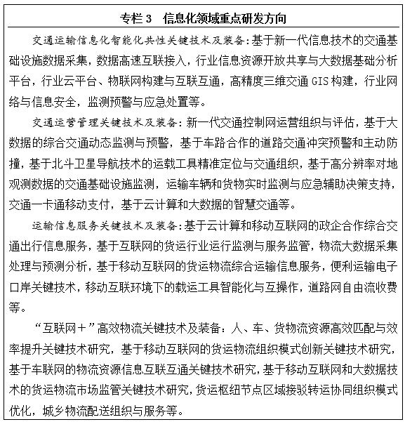 智能交通领域。重点开展了基于物联网的城市智能交通、高速公路运营管理、基础设施和交通状态感知、交通运输实时监控和监管、地理信息系统(GIS)、电子数据交换(EDI)和数据标准化等技术研发和集成应用,在船联网、车联网、物流信息平台、出行信息服务、数字航道、海事监管智能化等方面取得了显著进展,解决了载运工具移动数据交互技术难题,为营运车辆联网联控系统推广提供了技术支撑,显著提升了信息化智能化发展水平。