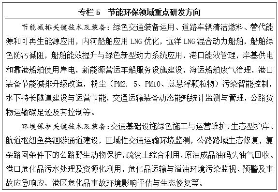 围绕构建绿色交通运输体系,开展节能减排、生态环保等方面新技术、新材料、新装备、新能源的研发与示范应用,积极发展新能源和液化天然气(LNG)等清洁能源运输装备,引导高端化、智能化的先进运输装备推广应用,推行适应节约土地要求的工程技术,提升土地和岸线等资源利用效率,支撑交通运输碳排放强度目标的实现,提高资源集约节约利用水平,通过技术进步推动绿色发展。