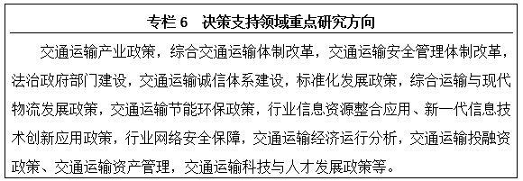 围绕服务国家战略、全面深化改革、法治交通建设、“互联网+”等重大问题及行业治理热点焦点难点问题,立足我国国情和交通运输实际,对标国际先进水平,加强发展战略、体制机制、产业政策、法律法规等理论与实践研究,强化宏观性、前瞻性、储备性研究,深入总结发展规律,不断创新中国特色交通运输发展理论,提升科学决策水平,推动交通运输治理体系和治理能力现代化。