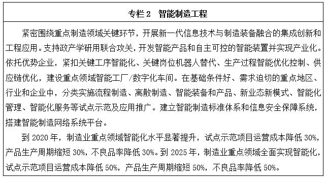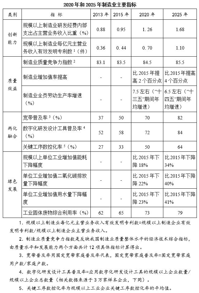 到2025年,制造业整体素质大幅提升,创新能力显著增强,全员劳动生产率明显提高,两化(工业化和信息化)融合迈上新台阶。重点行业单位工业增加值能耗、物耗及污染物排放达到世界先进水平。形成一批具有较强国际竞争力的跨国公司和产业集群,在全球产业分工和价值链中的地位明显提升。
