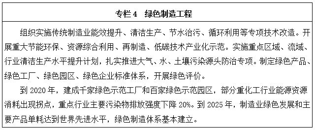 加大先进节能环保技术、工艺和装备的研发力度,加快制造业绿色改造升级;积极推行低碳化、循环化和集约化,提高制造业资源利用效率;强化产品全生命周期绿色管理,努力构建高效、清洁、低碳、循环的绿色制造体系。
