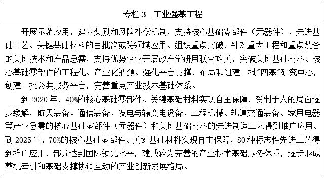 加强“四基”创新能力建设。强化前瞻性基础研究,着力解决影响核心基础零部件(元器件)产品性能和稳定性的关键共性技术。建立基础工艺创新体系,利用现有资源建立关键共性基础工艺研究机构,开展先进成型、加工等关键制造工艺联合攻关;支持企业开展工艺创新,培养工艺专业人才。加大基础专用材料研发力度,提高专用材料自给保障能力和制备技术水平。建立国家工业基础数据库,加强企业试验检测数据和计量数据的采集、管理、应用和积累。加大对“四基”领域技术研发的支持力度,引导产业投资基金和创业投资基金投向“四基”领域重点项目。