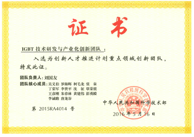 为突破 IGBT 关键技术、结束 IGBT 产品长期依赖进口的局面,该团队负责人刘国友2010 年受命成立功率半导体海外研发中心,组建一支专门从事IGBT基础核心前沿技术研发的团队,成员包含设计、工艺和应用工程师等研发人员,专业领域覆盖材料、微电子、半导体物理等学科,目前已形成 100人以上、高端人才汇聚的研发团队。在院士领衔、团队负责人带领下,本团队研发的 IGBT 领域新产品、新工艺,特别是新一代高功率密度 IGBT 芯片与模块关键技术,已达到国际先进水平,产品与国际同类产品相当。十二五期间 ,团队承担国家 02 专项、“863”计划、国家发改委专项等 10 余项国家级项目,先后完成轨道交通用 3300VIGBT 芯片及模块、3300V-6500V 高功率密度 IGBT 芯片及模块的研究开发,达到国际先进水平并实现批量应用。团队核心成员在 IGBT 技术领域申报专利 50 余项,在国内外核心期刊和国际会议发表论文 30 余篇,获得省部级及以上科技进步奖 7 项,形成一整套具有自主知识产权的 IGBT 芯片及其模块“设计—工艺—应用”产业化技术,彻底打破国外的技术封锁与产品垄断。通过集成创新,本团队支撑建成国内领先、国际一流的 8 英寸 IGBT 芯片线及其自动化的模块封装线。该团队研究技术成果达到国际先进水平并实现批量应用,迫使国外产品多次大幅降价,彻底摆脱轨道交通、智能电网等战略性新兴产业对国外核心器件的依赖,确保国家安全与国民经济健康发展。