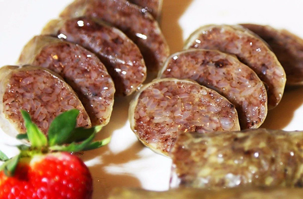 血灌粑的主料为糯米、猪肠、热猪血。血灌粑色泽黑红鲜亮,其味道辣麻香软,有荤有素,营养丰富,腻而不沾,为下酒佐餐之佳品。