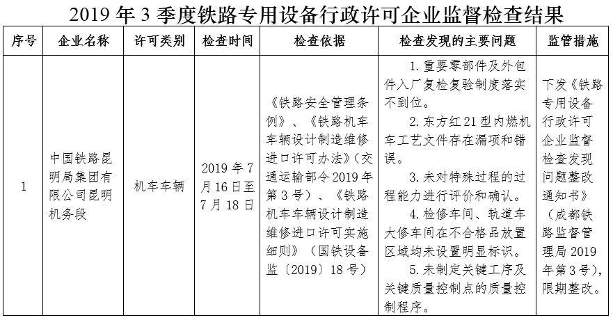 2019年3季度,成都铁路监督管理局依据《国家铁路局关于印发<2019年度铁路专用设备行政许可企业监督检查计划>的通知》(国铁设备监函〔2019〕2号),监督检查铁路专用设备行政许可企业1家,下发《铁路专用设备行政许可企业监督检查发现问题整改通知书》1份,要求相关企业对监督检查发现的问题进行整改,并将整改措施和整改完成情况及时报成都铁路监督管理局。现将监督检查结果通报如下: