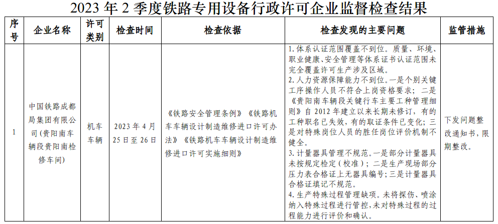成都铁路监督管理局2023年2季度铁路专用设备行政许可企业监督检查情况通报