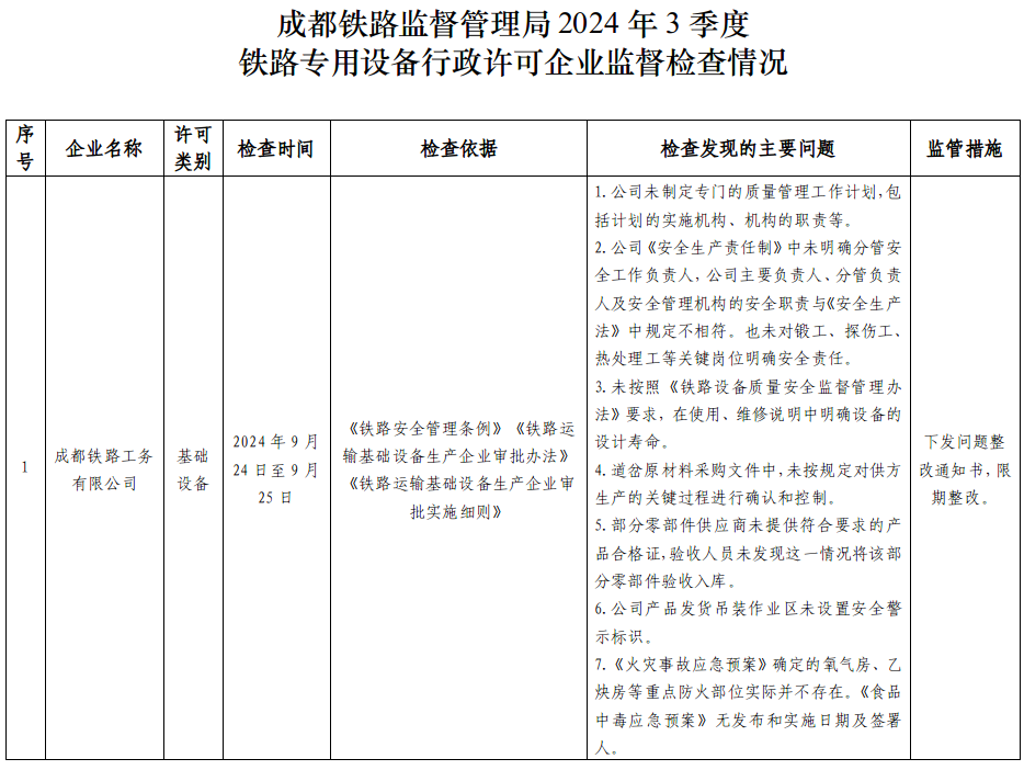 2024年3季度,成都铁路监督管理局依据《行政许可法》《铁路安全管理条例》《铁路机车车辆设计制造维修进口许可办法》《铁路运输基础设备生产企业审批办法》等法律法规、规章规范,按照《国家铁路局关于印发<2024年度铁路专用设备行政许可企业监督检查计划>的通知》(国铁设备监函〔2024〕3号)要求,依法对成都铁路工务有限公司开展监督检查,发现问题7项,下发问题整改通知书1份,要求受检企业对监督检查发现的问题进行整改,将整改措施和整改情况及时报送成都铁路监督管理局。现将监督检查结果通报如下: