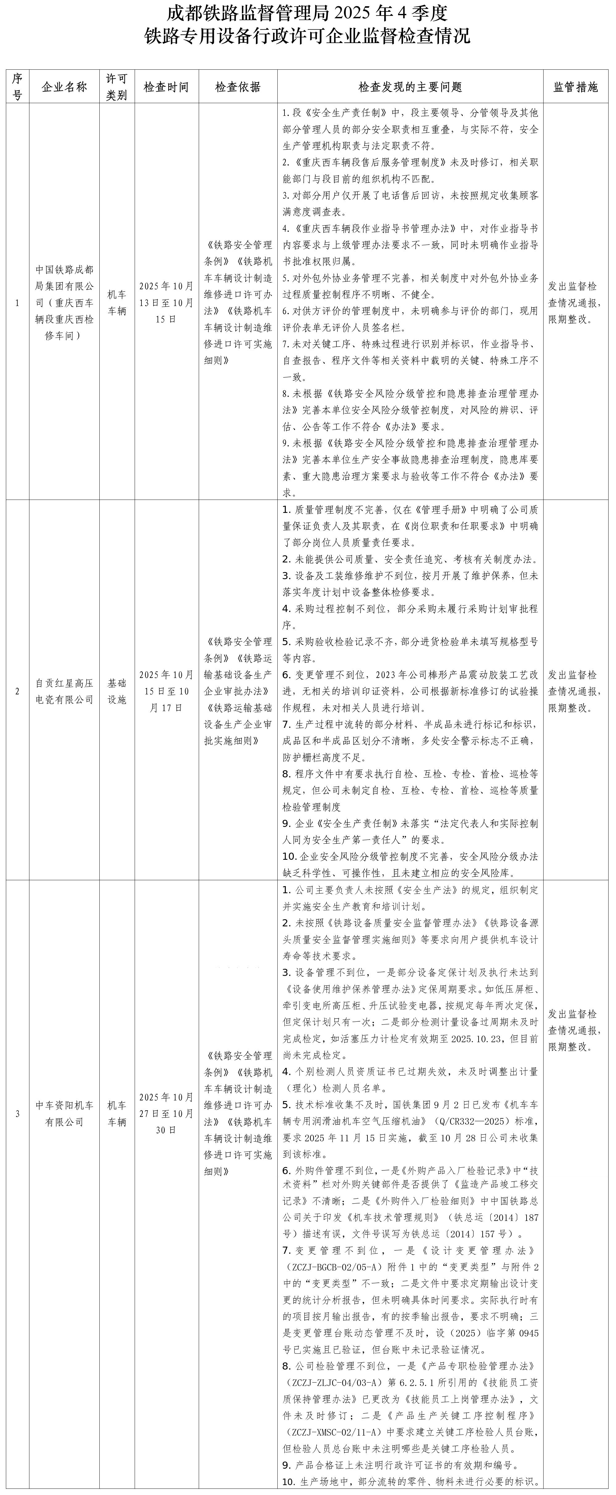 2025年4季度,成都铁路监督管理局依据《中华人民共和国行政许可法》《铁路安全管理条例》《铁路机车车辆设计制造维修进口许可办法》《铁路运输基础设备生产企业审批办法》等法律法规、规章规范,按照《国家铁路局关于印发〈2025年度铁路专用设备行政许可企业监督检查计划〉的通知》(国铁设备监函〔2025〕8号)要求,依法对中国铁路成都局集团有限公司(重庆西车辆段重庆西检修车间)、自贡红星高压电瓷有限公司、中车资阳机车有限公司共3家企业开展铁路专用设备行政许可企业监督检查,发现问题29项,发出检查通报3份,要求受检企业对监督检查发现的问题进行整改,将整改措施和整改情况及时报送成都铁路监督管理局。现将监督检查情况通报如下: