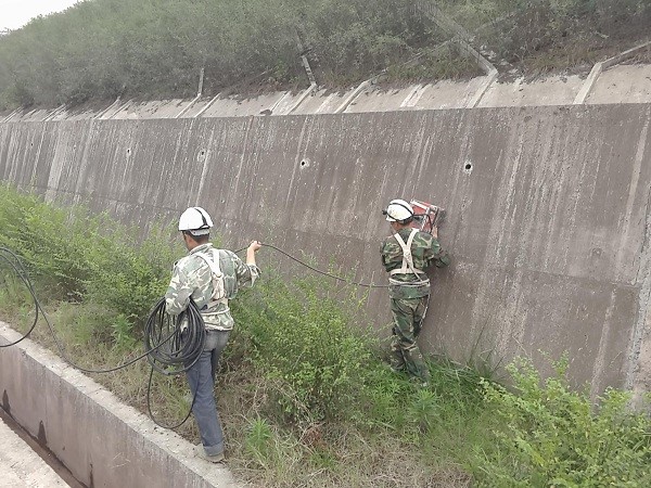 图为专业人员对新龙泉隧道衬砌质量进行检测。