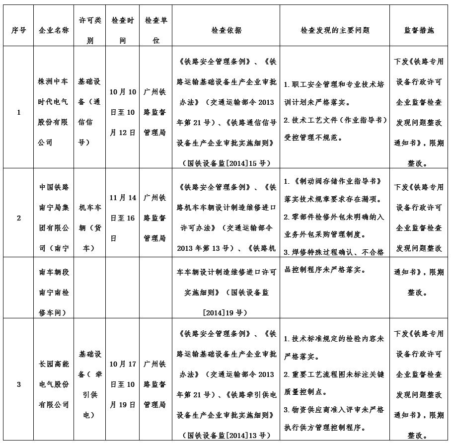 按照《行政许可法》、《铁路安全管理条例》等法律法规和铁路专用设备相关行政许可办法及实施细则有关规定,依据《铁路专用设备行政许可企业监督检查计划管理办法》(国铁设备监〔2014〕27号)、《2018年度铁路专用设备行政许可企业监督检查计划》(国铁设备监〔2017〕181号),依法对株洲中车时代电气股份有限公司、中国铁路南宁局集团有限公司(南宁南车辆段南宁南检修车间)、长园高能电气股份有限公司开展监督检查,共发现问题17项,下发《铁路专用设备行政许可企业监督检查发现问题整改通知书》3份。同时要求相关企业对监督检查发现的问题进行整改,并将整改措施和整改情况及时报广州铁路监督管理局。广州铁路监督管理局将结合履职工作实际,适时对企业整改情况进行复查。现将监督检查结果通报如下: