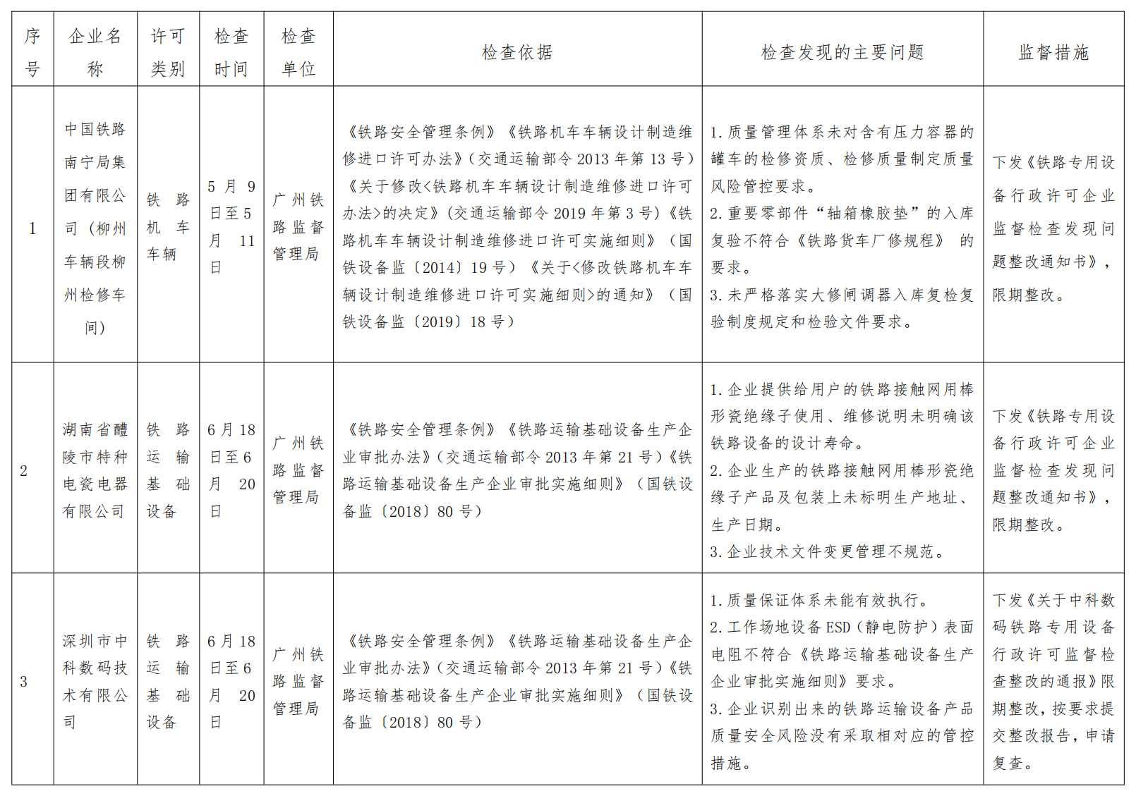 针对中国铁路南宁局集团有限公司 (柳州车辆段柳州检修车间)、湖南省醴陵市特种电瓷电器有限公司存在的各9项问题,下发《铁路专用设备行政许可企业监督检查发现问题整改通知书》2份;深圳市中科数码技术有限公司11项问题,根据相关文件规定,此次监督检查受检企业判为不合格,下发《关于铁路专用设备行政许可监督检查情况的通报》,要求受检企业对监督检查发现的问题进行整改,按时提交整改报告和复查申请。同时,广州铁路监督管理局将结合履职工作实际,适时对企业整改情况进行复查。现将监督检查结果通报如下: