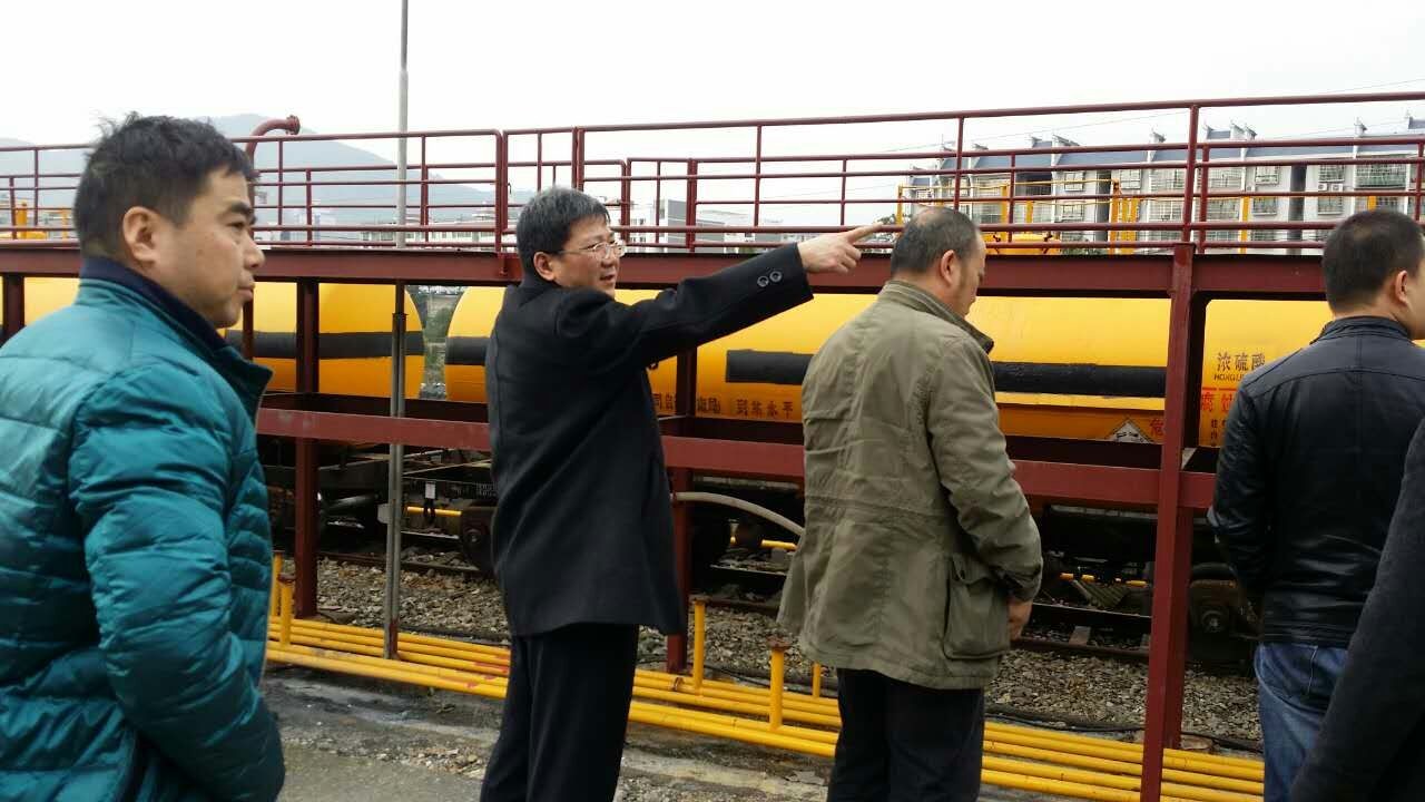 图为检查组在铁路专用线进行危化品运输安全检查。