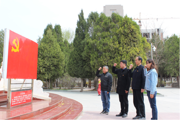 图为执法监察办公室党支部在会师纪念塔下重温入党誓词。