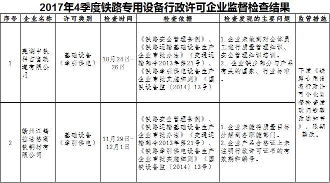 2017年4季度,上海铁路监督管理局认真贯彻落实国务院“简政放权、放管结合、优化服务”和“双随机、一公开”监管改革精神,持续加强铁路专用设备产品质量安全监管工作。按照《行政许可法》、《铁路安全管理条例》等法律法规和铁路专用设备相关行政许可办法及实施细则有关规定,依据《铁路专用设备行政许可企业监督检查计划管理办法》(国铁设备监〔2014〕27号)、《2017年度铁路专用设备行政许可企业监督检查计划》(国铁设备监〔2016〕188号),依法对芜湖中铁科吉富轨道有限公司、赣州江钨拉法格高铁铜材有限公司开展监督检查,发现问题13项,下发《铁路专用设备行政许可企业监督检查发现问题整改通知书》2份。同时要求相关企业对监督检查发现的问题进行整改,并将整改措施和整改情况及时报上海铁路监督管理局。上海铁路监督管理局将结合履职工作实际,适时对企业整改情况进行复查。现将监督检查结果通报如下: