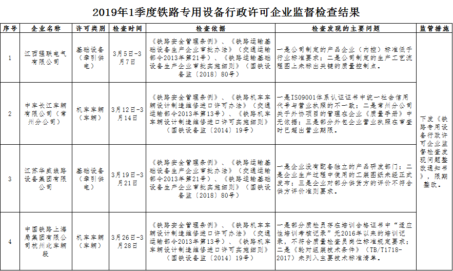 2019年1季度,上海铁路监督管理局认真贯彻落实国务院“简政放权、放管结合、优化服务”和“双随机、一公开”监管改革精神,持续加强铁路专用设备产品质量安全监管工作。按照《行政许可法》、《铁路安全管理条例》等法律法规和铁路专用设备相关行政许可办法及实施细则有关规定,依据《铁路专用设备行政许可企业监督检查计划管理办法》(国铁设备监〔2014〕27号)、《国家铁路局关于印发2019年度铁路专用设备行政许可企业监督检查计划的通知》(国铁设备监函〔2019〕2号),依法对江苏华威线路设备集团有限公司、江西强联电气有限公司、中车长江车辆有限公司常州分公司、上海局集团有限公司杭州北车辆段开展监督检查,发现问题28项,下发《铁路专用设备行政许可企业监督检查发现问题整改通知书》4份。同时要求相关企业对监督检查发现的问题进行整改,并将整改措施和整改情况及时报上海铁路监督管理局。上海铁路监督管理局将结合履职工作实际,适时对企业整改情况进行复查。现将监督检查结果通报如下: