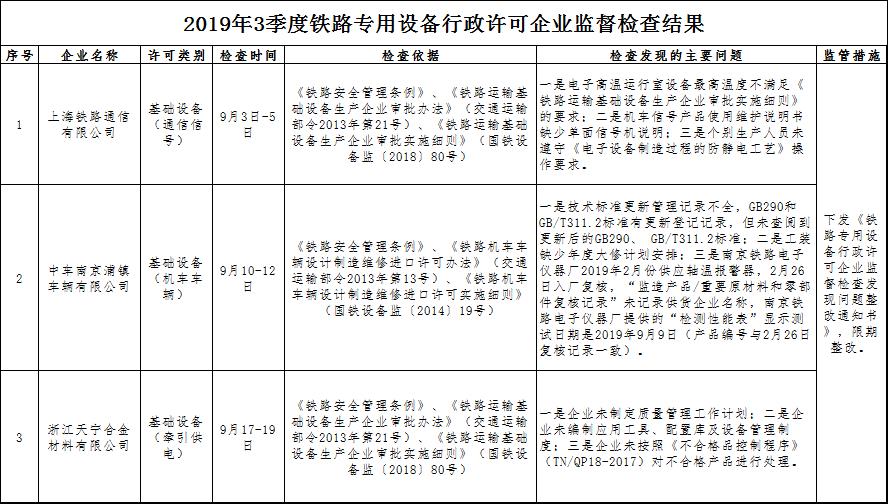 2019年3季度,上海铁路监督管理局认真贯彻落实国务院“简政放权、放管结合、优化服务”和“双随机、一公开”监管改革精神,持续加强铁路专用设备产品质量安全监管工作。按照《行政许可法》、《铁路安全管理条例》等法律法规和铁路专用设备相关行政许可办法及实施细则有关规定,依据《铁路专用设备行政许可企业监督检查计划管理办法》(国铁设备监〔2014〕27号)、《国家铁路局关于印发2019年度铁路专用设备行政许可企业监督检查计划的通知》(国铁设备监函〔2019〕2号),依法上海铁路通信有限公司、中车南京浦镇车辆有限公司和浙江天宁合金材料有限公司开展监督检查,发现问题21项,下发《铁路专用设备行政许可企业监督检查发现问题整改通知书》3份。同时要求相关企业对监督检查发现的问题进行整改,并将整改措施和整改情况及时报上海铁路监督管理局。上海铁路监督管理局将结合履职工作实际,适时对企业整改情况进行复查。现将监督检查结果通报如下: