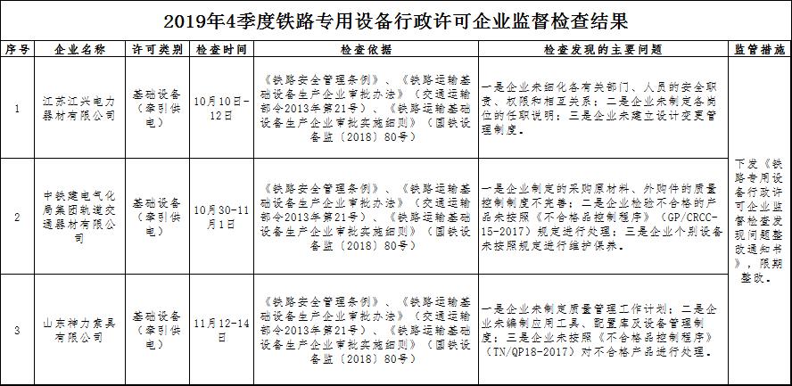 2019年4季度,上海铁路监督管理局认真贯彻落实国务院“简政放权、放管结合、优化服务”和“双随机、一公开”监管改革精神,持续加强铁路专用设备产品质量安全监管工作。按照《行政许可法》、《铁路安全管理条例》等法律法规和铁路专用设备相关行政许可办法及实施细则有关规定,依据《铁路专用设备行政许可企业监督检查计划管理办法》(国铁设备监〔2014〕27号)、《国家铁路局关于印发2019年度铁路专用设备行政许可企业监督检查计划的通知》(国铁设备监函〔2019〕2号),依法对江苏江兴电力器材有限公司、中铁建电气化局集团轨道交通器材有限公司和山东神力索具有限公司开展监督检查,发现问题22项,下发《铁路专用设备行政许可企业监督检查发现问题整改通知书》3份。同时要求相关企业对监督检查发现的问题进行整改,并将整改措施和整改情况及时报上海铁路监督管理局。上海铁路监督管理局将结合履职工作实际,适时对企业整改情况进行复查。现将监督检查结果通报如下: