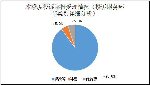 投诉票务的20份投诉中,投诉退改签18份、占比90%,投诉补票1份、占比5%,投诉优待票1份、占比5%。详见图2。
