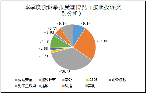 按照投诉类别分析,投诉客运安全5份、占比9.1%,投诉服务环节14份、占比25.5%,投诉票务20份、占比36.4%,投诉12306的1份、占比1.8%,投诉设备设施1份、占比1.8%,投诉列车正晚点5份、占比9.1%,投诉运输1份、占比1.8%,投诉货运3份、占比5.5%,投诉其他5份、占比9.1%。详见图1。