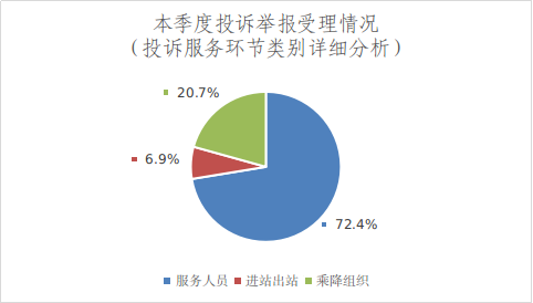 投诉服务环节的29份投诉中,投诉服务人员为21份、占比72.4%,投诉进站出站2份、占比6.9%,投诉乘降组织6份、占比20.7%。详见图2。