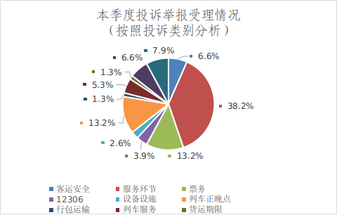 按照投诉类别分析,投诉客运安全5份、占比6.6%,投诉服务环节29份、占比38.2%,投诉票务10份、占比13.2%,投诉12306的3份、占比3.9%,投诉设备设施2份、占比2.6%,投诉列车正晚点10份、占比13.2%,投诉行包运输1份、占比1.3%,投诉列车服务4份、占比5.3%,投诉货运期限1份、占比1.3%,投诉运输5份、占比6.6%,投诉其他6份、占比7.9%。详见图1。