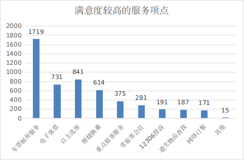 旅客满意度较高的项目有车票候补服务、自主选座、电子客票和便捷换乘等方面。详见图4。