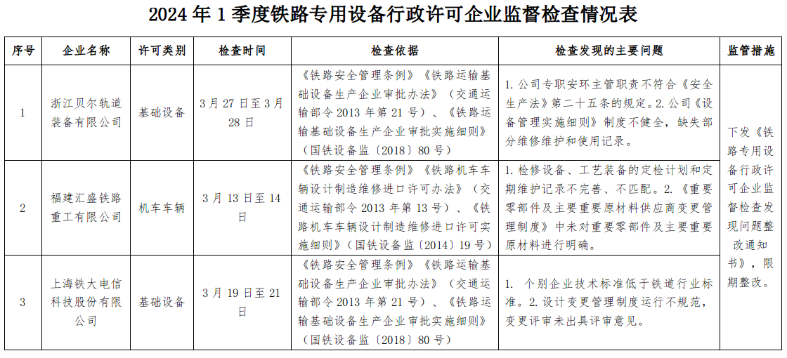 2024年1季度,上海铁路监督管理局依据国家铁路局关于印发《2024年度铁路专用设备行政许可企业监督检查计划的通知》(国铁设备监函〔2024〕3号),依法对浙江贝尔轨道装备有限公司、福建汇盛铁路重工有限公司、上海铁大电信科技股份有限公司 3家企业开展监督检查,发现问题 22项,下发《铁路专用设备行政许可企业监督检查发现问题整改通知书》3份。要求受检企业对监督检查发现的问题进行整改,将整改情况及时报送上海铁路监督管理局。现将监督检查结果通报如下: