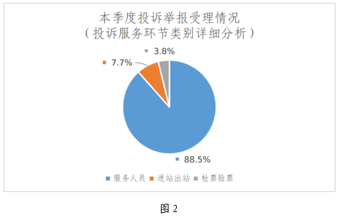 投诉服务环节的26件投诉中,投诉服务人员为23件、占比88.5%,投诉进站出站2件、占比7.7%,投诉检票验票1件、占比3.8%。详见图2。