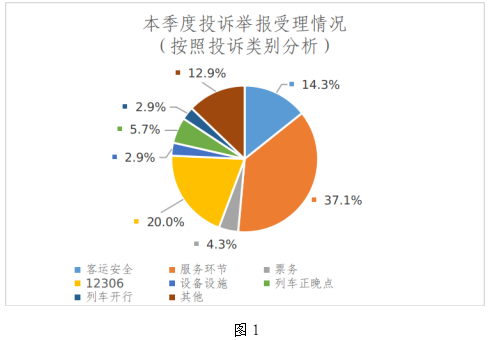 按照投诉类别分析,投诉客运安全10件、占比14.3%,投诉服务环节26件、占比37.1%,投诉票务3件、占比4.3%,投诉12306的14件、占比20%,投诉设备设施2件、占比2.9%,投诉列车正晚点4件、占比5.7%,投诉列车开行2件、占比2.9%,投诉其他9件、占比12.9%。详见图1。