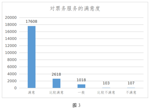 3.问卷调查情况分析。本季度问卷调查中,对于票务服务,82.07%旅客选择“满意”,12.2%旅客选择“比较满意”,旅客较为不满、认为需要改善的主要集中在购票、改签和退票方面。可以看出虽然较多旅客对于现阶段购票便利满意度较高,但是局限于铁路运输能力,有不少旅客在节假日买不到心仪列车的车票,较为不满。详见图3。