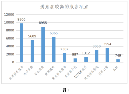 旅客满意度较高的项目有车票候补服务、自主选座、便捷换乘和电子客票等方面。详见图5。
