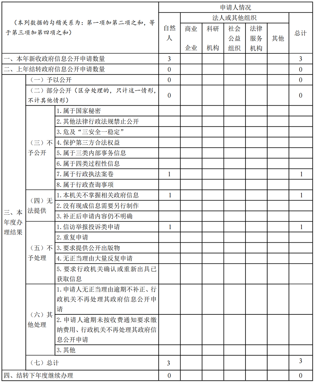 (二)依申请公开方面。依法规范做好政府信息依申请公开受理、审查、处理、答复工作,保障公民、法人和其他组织依法获取政府信息的权利。全年共收到政府信息公开申请3件,均在规定时限内依法予以答复。