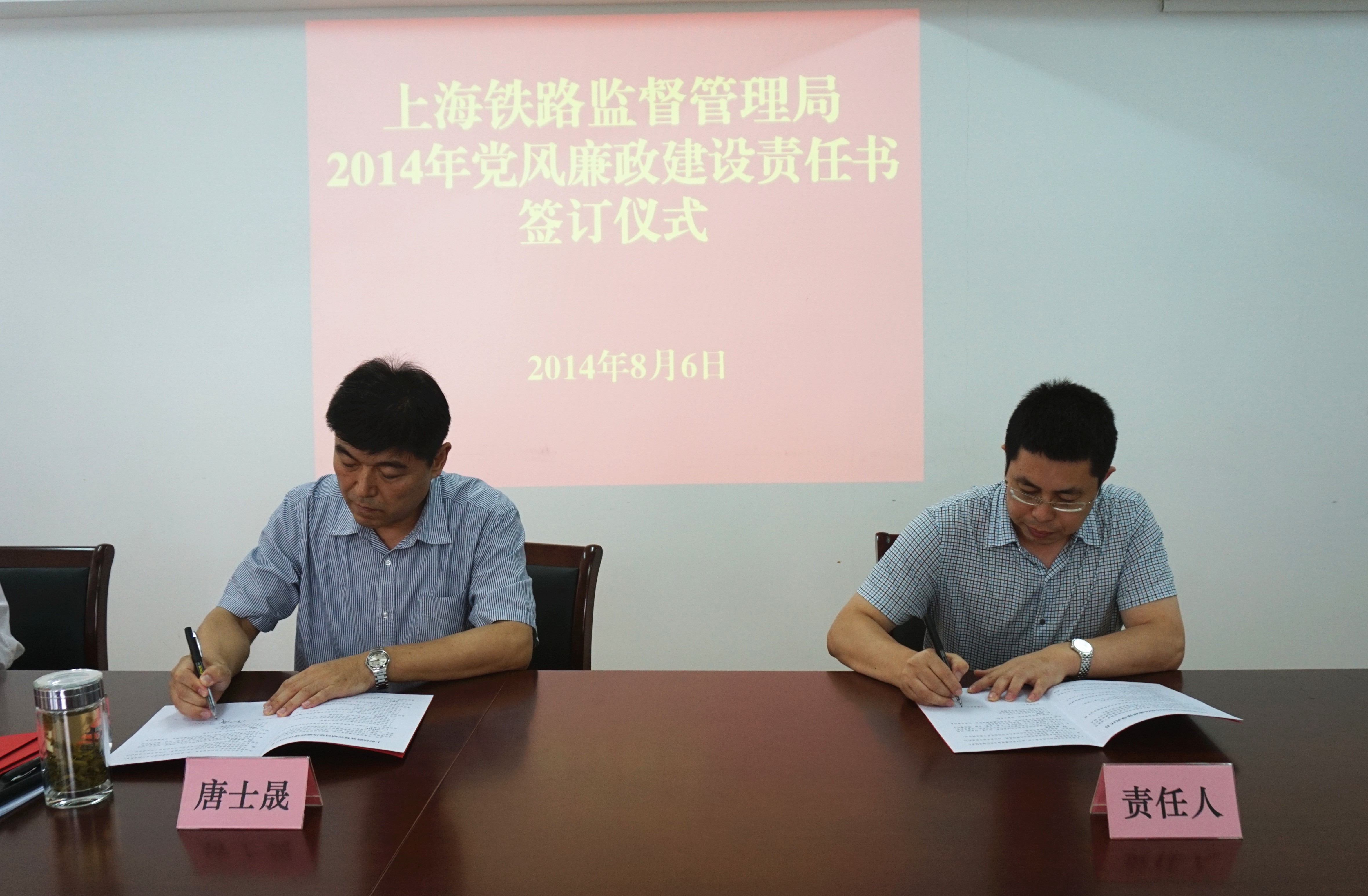 8月6日,上海铁路监管局党组书记、局长唐士晟分别与各处室负责同志签订了2014年党风廉政建设责任书,并要求党员干部提高思想认识,认真抓好各项廉政制度的落实,严格自律、作出表率,把党风廉政建设时刻放在心上、扛在肩上、抓在手上,提高思想和行动的主动性和自觉性,努力在建局之初就形成良好的作风和铁的纪律。