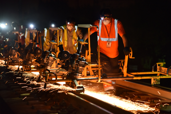 图为培训人员现场观摩打磨钢轨作业。