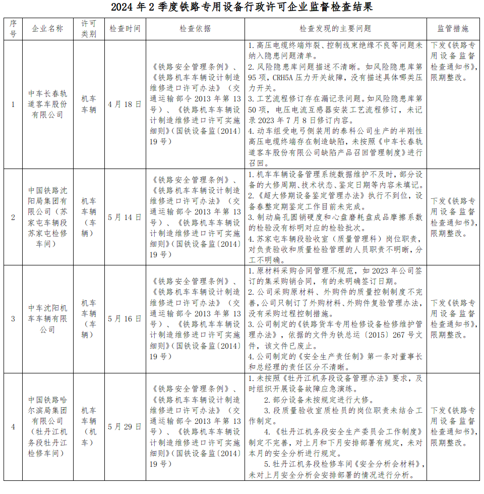 2024年2季度,沈阳铁路监督管理局认真贯彻落实国务院“简政放权、放管结合、优化服务”和“双随机、一公开”监管规定,持续加强铁路专用设备产品质量安全监管工作。按照《行政许可法》、《铁路安全管理条例》等法律法规和铁路专用设备相关行政许可办法及实施细则有关规定,依据《铁路专用设备行政许可企业监督检查计划管理办法》(国铁设备监〔2014〕27号)、《国家铁路局关于印发2024年度铁路专用设备行政许可企业监督检查计划的通知》(国铁设备监〔2024〕3号),按照“双随机、一公开”规定,依法对中车长春轨道客车股份有限公司、中国铁路沈阳局集团有限公司(苏家屯车辆段苏家屯检修车间)、中车沈阳机车车辆有限公司、中国铁路哈尔滨局集团有限公司(牡丹江机务段牡丹江检修车间)开展监督检查,发现问题17项,下发《铁路专用设备监督检查通知书》4份。同时要求相关企业对监督检查发现的问题进行整改,并将整改措施和整改情况及时报沈阳铁路监督管理局。沈阳铁路监督管理局将结合履职工作实际,适时对企业整改情况进行复查。现将监督检查结果通报如下: