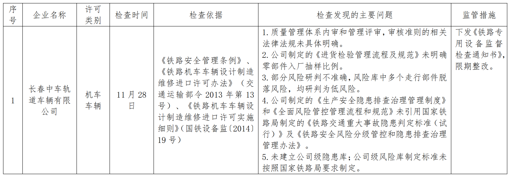 2024年4季度,沈阳铁路监督管理局认真贯彻落实国务院“简政放权、放管结合、优化服务”和“双随机、一公开”监管规定,持续加强铁路专用设备产品质量安全监管工作。按照《行政许可法》、《铁路安全管理条例》等法律法规和铁路专用设备相关行政许可办法及实施细则有关规定,依据《铁路专用设备行政许可企业监督检查计划管理办法》(国铁设备监〔2014〕27号)、《国家铁路局关于印发2024年度铁路专用设备行政许可企业监督检查计划的通知》(国铁设备监〔2024〕3号),按照“双随机、一公开”规定,依法对长春中车轨道车辆有限公司开展监督检查,发现问题5项,下发《铁路专用设备监督检查通知书》1份。同时要求企业对监督检查发现的问题进行整改,并将整改措施和整改情况及时报沈阳铁路监督管理局。沈阳铁路监督管理局将结合履职工作实际,适时对企业整改情况进行复查。现将监督检查结果通报如下: