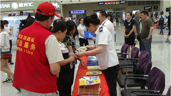 通过在候车区设立安全咨询点、摆放安全宣传挂图展板、发放宣传教育材料、现场解答旅客问询等方式,宣传《铁路安全管理条例》、《安全生产法》、《铁路危险货物运输安全监督管理规定》等法律法规,使旅客直观生动地了解铁路安全知识,增强安全法治及安全出行意识。