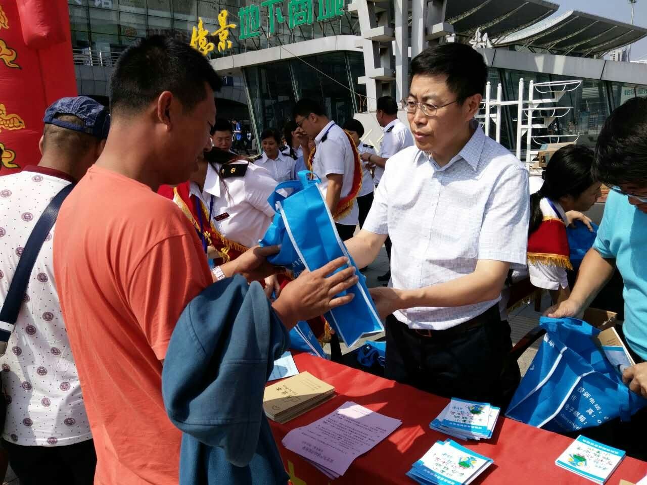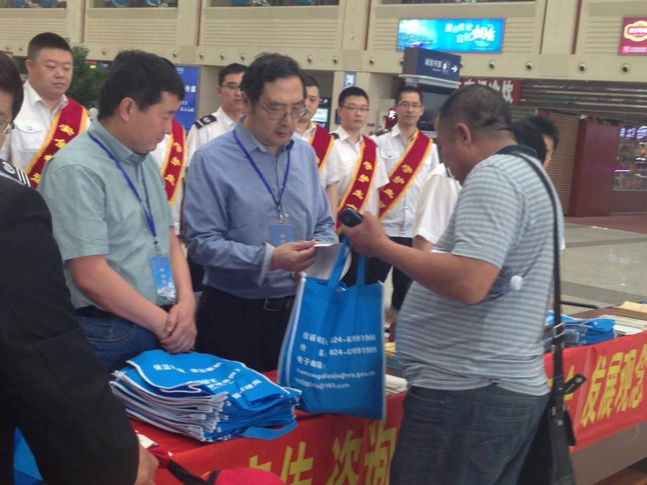6月16日,沈阳铁路监管局由局领导带队,联合沈阳、哈尔滨铁路局及铁路公安部门,分别在沈阳北站、长春站、哈尔滨西站、齐齐哈尔站组织开展铁路安全生产宣传咨询日活动。活动期间,通过设立安全咨询服务站、摆放安全生产宣传展板、播放宣传教育警示片、发放铁路安全宣传品及资料和现场解答旅客问询等方式,广泛宣传《安全生产法》、《铁路安全管理条例》等安全法律法规和铁路安全常识,引导旅客进一步增强安全发展理念,共同维护铁路安全。图为沈阳铁路监管局领导带队向旅客发放安全生产宣传资料。