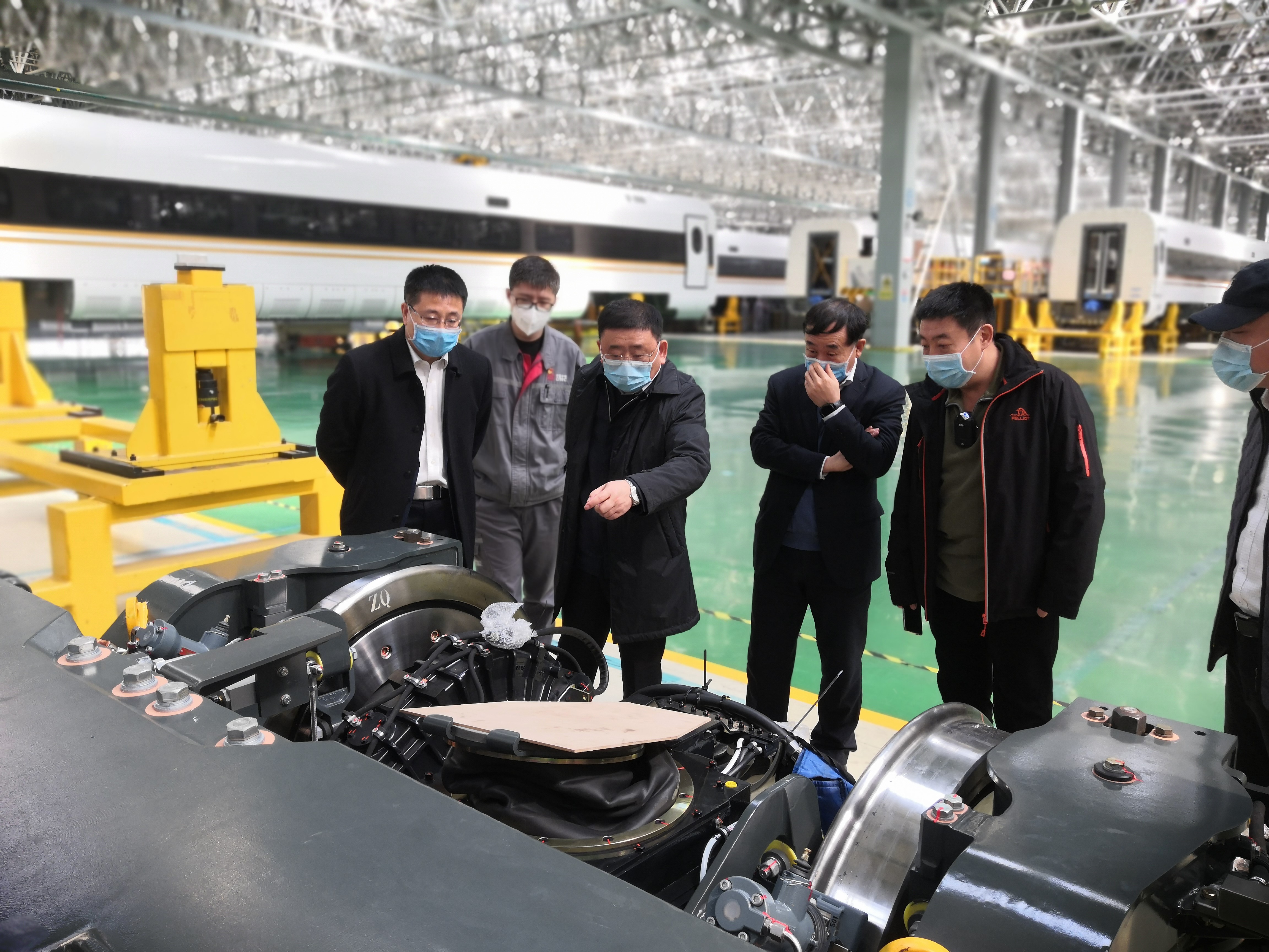 图为调研组查看动车组转向架情况