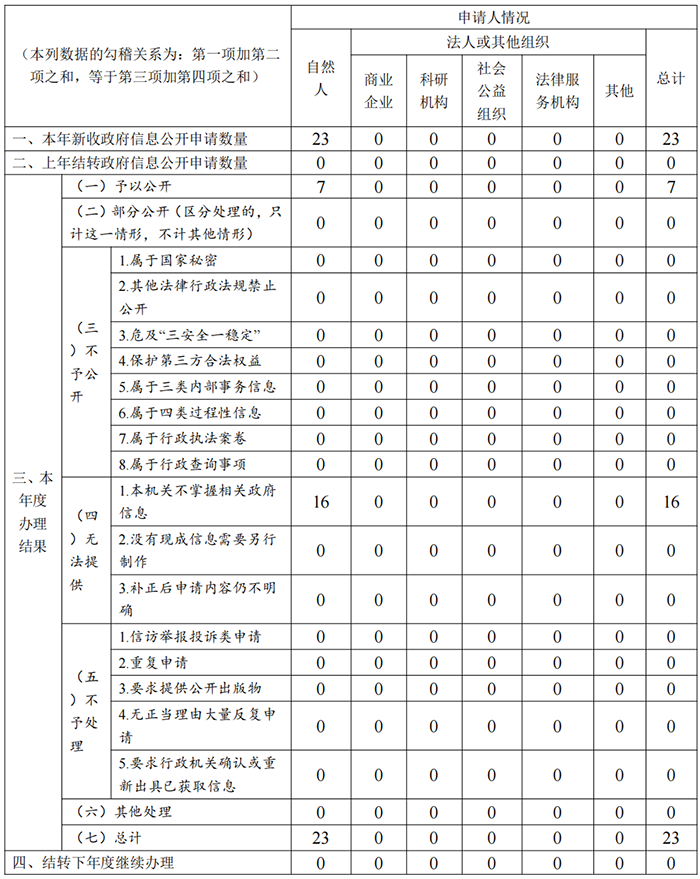 2.做好依申请公开。积极回应群众关切,严格执行依申请公开工作机制要求,规范接收渠道,持续推进工作标准化、规范化,依法保障群众信息需求。全年收到的23项依申请公开全部按期办结。