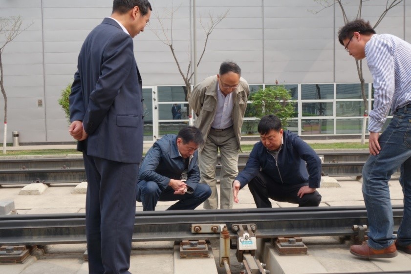图为调研组现场查看新型道岔转辙机试验情况。