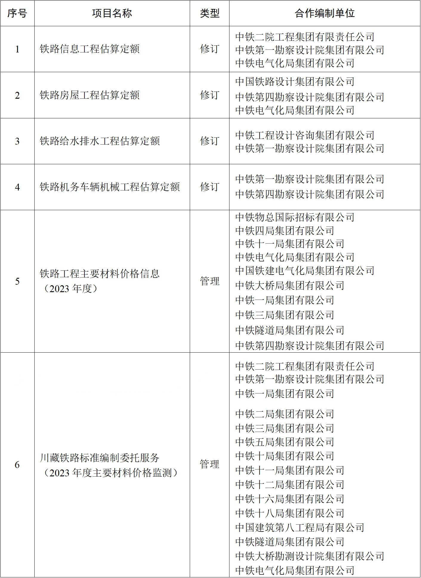 2023年铁路工程造价标准项目合作编制单位汇总表