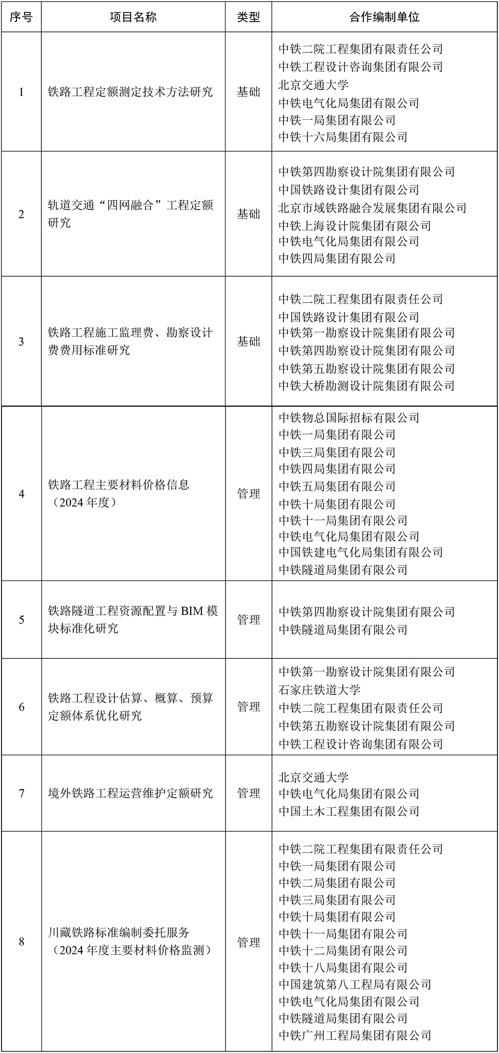 2024年铁路工程造价标准项目合作编制单位汇总表