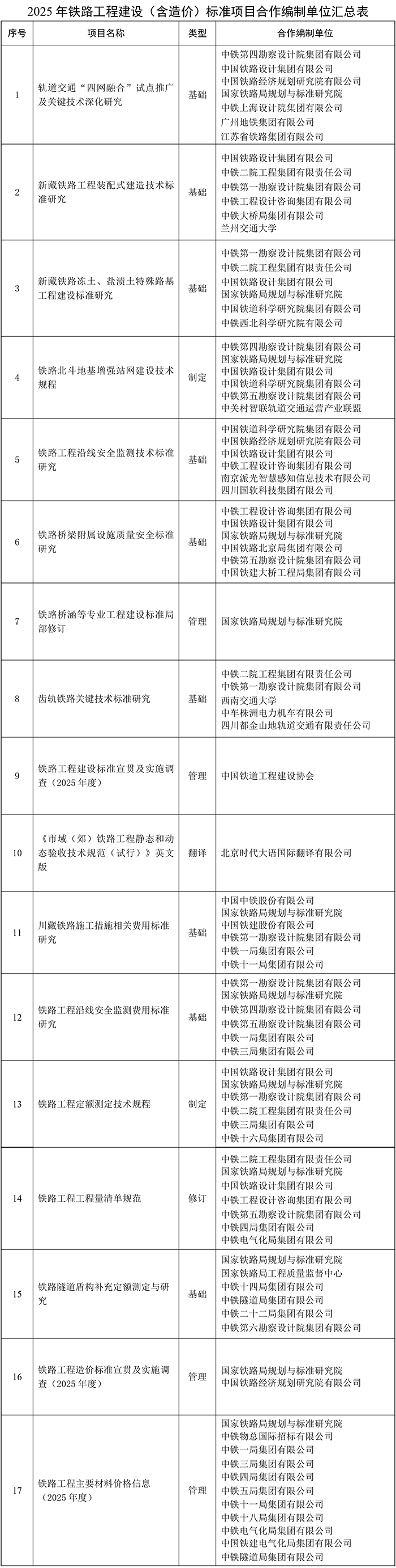 国家铁路局规划与标准研究院2025年铁路工程建设(含造价)标准项目合作编制单位选择方案公示